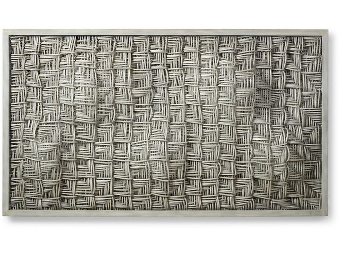 Decoracion de pared de rattan tejido tridimensional, con marco gruso de madera. Acabado en color blanco grisaceo. Se puede colgar en sentido horizontal y vertical.