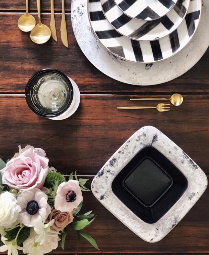 Cuenco cuadrado artesanal de cemento blanco, color negro y marmoleado. Medidas: 22cm L x 22cm A x 6cm H.